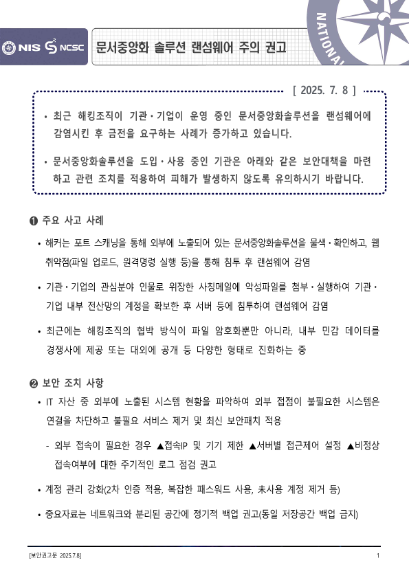 사이트 전체메뉴 사이버안보란? 사이버안보란? 사이버안보 개념 국가사이버안보 수행체계 국가정보원의 역할 센터소개 센터소개 개소 및 이력 주요업무 사이버위협 대응 사이버위협 예방 사이버위협 정보공유·협력 쉽게 보는 주요 업무 알림마당 Q&A 사이버위협 사이버위협 사이버위기경보 보안 권고문 취약점 신고 보안적합성검증 보안적합성검증 개요 및 체계 보안기능 시험제도 안전성 검증필 제품목록 보안적합성검증 자료실 암호모듈검증 암호모듈검증 개요 및 체계 검증대상 암호알고리즘 검증필 암호모듈 목록 공지사항 자료실 자료실 관계법령 및 법규 지침·가이드·공시 발간자료 교육자료 사이버안보 실생활속 위협 자주 묻는 질문 사전 공인인증 획득 제품 보안적합성 검증 암호모듈검증